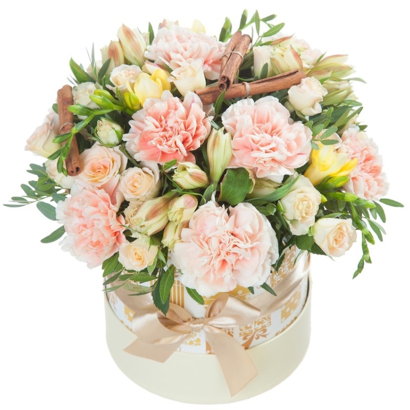 Букет состоит из 5 кустовых роз, 4 ветки альстромерии, 2 фрезии, 7 гвоздик, зелень, палочки корицы, коробка, оазис.